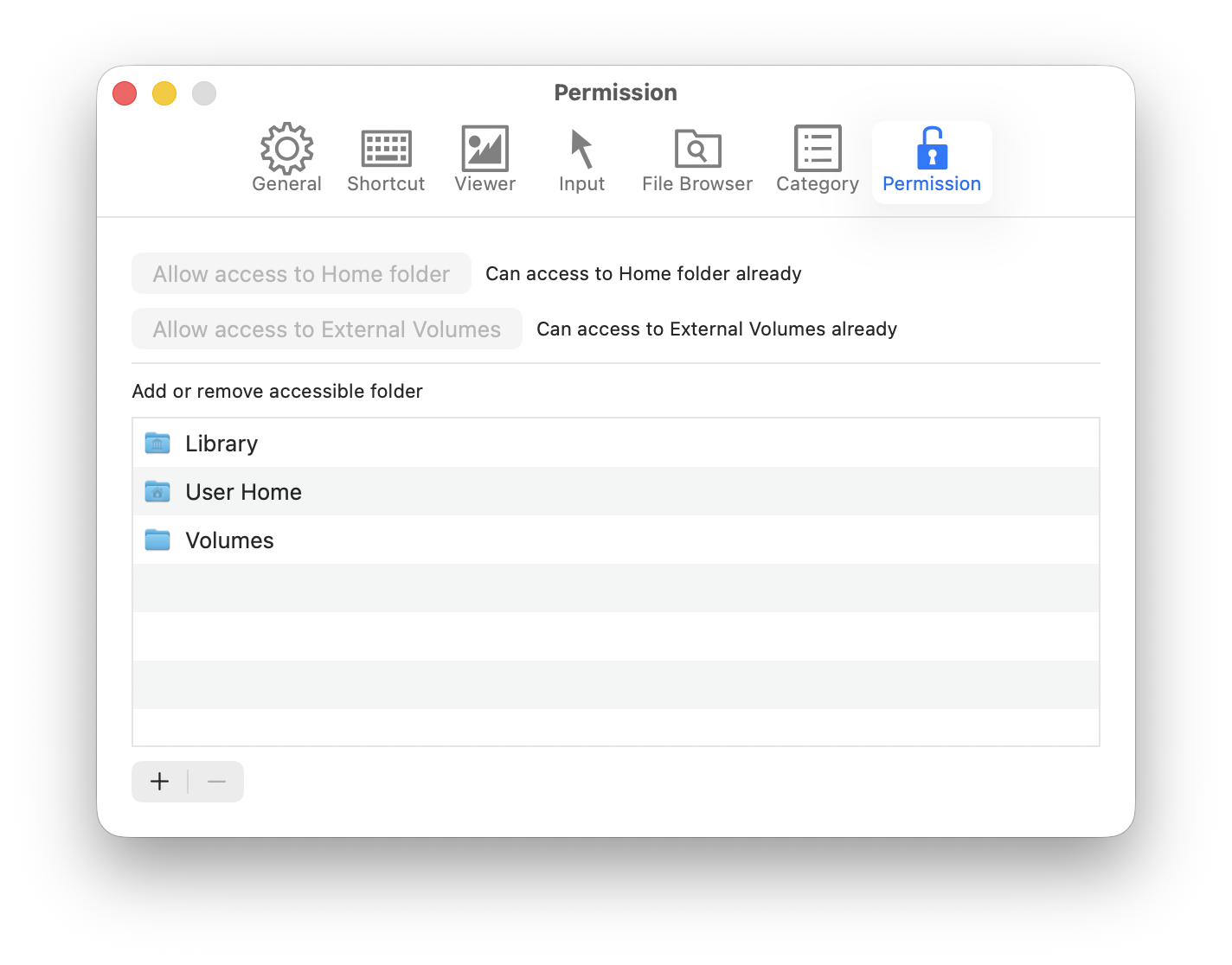 - Therefore, if you’re using macOS 26 or later, click the [Allow access to home folder] and [Allow access to external volumes] buttons at the top of the Permissions tab to add access to the home folder and external volumes.